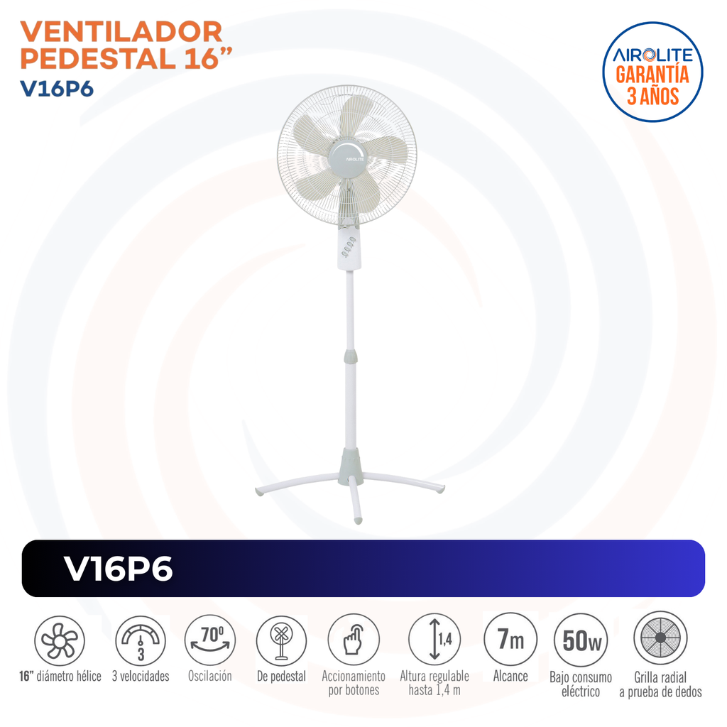 Con una hélice de 16" de diámetro, el Ventilador de Pedestal V16P6 Airolite está diseñado para ofrecer un rendimiento óptimo, asegurando un ambiente fresco y relajante durante todo el día. ¡Transforma tus espacios y disfruta de la comodidad que mereces!